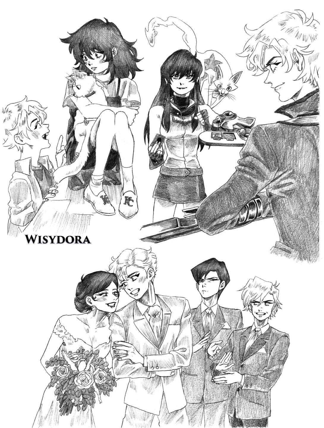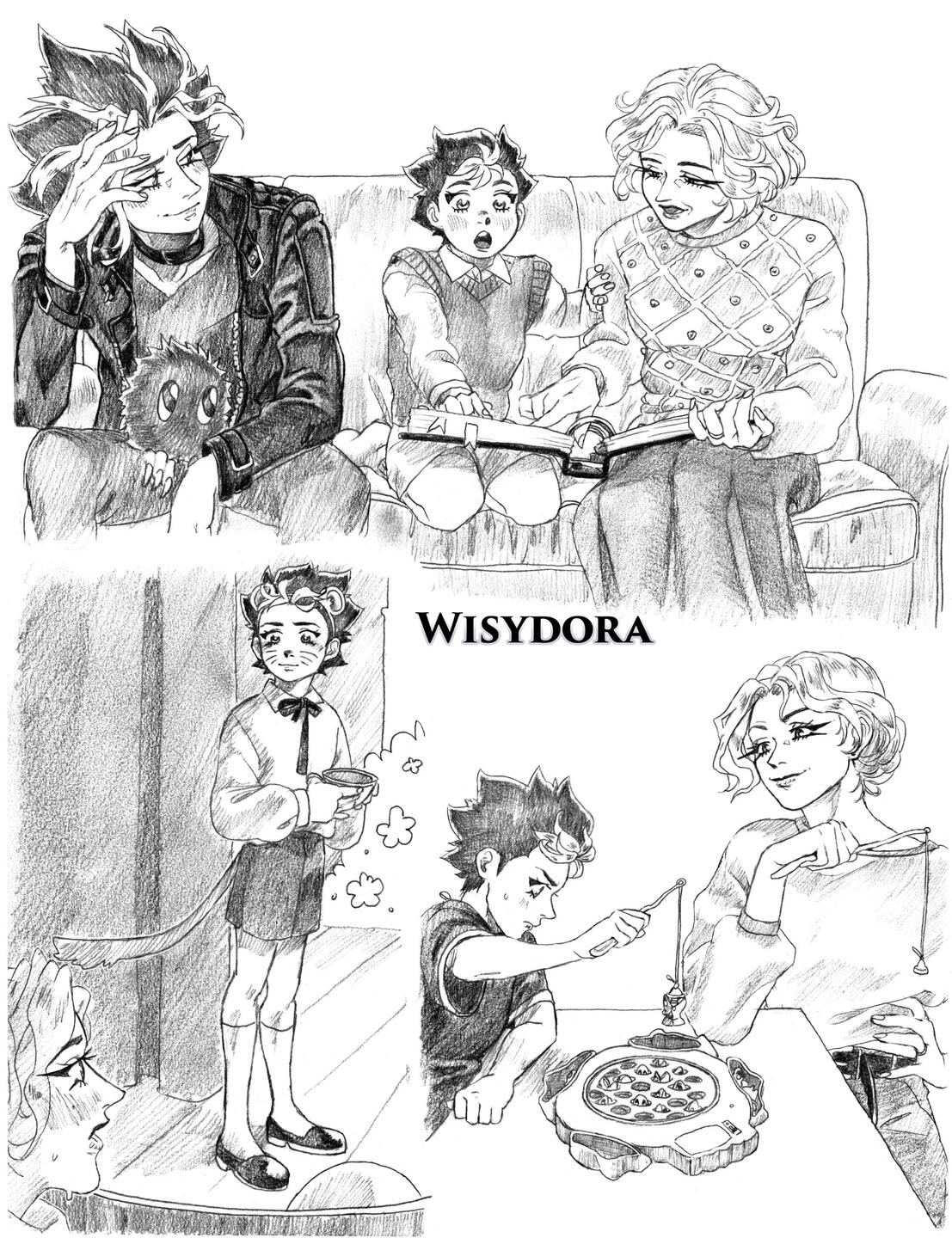 *I work on Tuesdays and Thursdays.*Patrons have a 10% discount on every commission.*My work consists of clear ideas from the beginning, so I don't offer corrections in the process, since corrections are hard to make in my medium (pencil art). I'm willing to discuss ideas before working on them.*If you don't like the final product, I can offer a solution in the form of an extra drawing, but I don't offer refunds.*If you have any questions, please let me know through DMs or Discord (Wisydora)